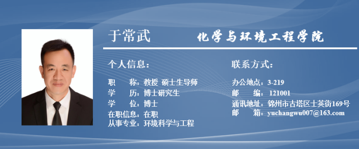于常武,男,1975年生,内蒙古赤峰人,博士,教授,硕士生导师,辽宁省普通高等学校本科教学名师、锦州高校名师,先后指导研究生8名。2010年9月毕业于大连理工大学水文学及水资源专业,获工学博士学位。现任辽宁工业大学教务处处长、创新创业教育中心主任,负责全校教育教学和创新创业教育工作。 长期从事环境科学与工程专业教学与科研工作。近年来,重点围绕工业废水处理的高级氧化、光催化氧化、吸附、反渗透、絮凝净化、大气污染防治及工业废渣资源化等方面开展技术研发、工艺设计与工程应用工作,在工业废水处理、大气污染物迁移转化规律及数值模拟、土壤污染调查与评价、区域环境重金属污染环境地球化学评价、畜禽污染防治规划、生态城市建设规划以及工程概预算等方面开展了大量研究与应用工作,主持或参加横纵向项目10余项,发表SCI、EI、CSCD及中文核心等学术论文30余篇。主讲课程《水污染控制工程》建成辽宁省一流本科课程,教育教学研究成果获辽宁省教学成果一等奖3项,辽宁工业大学校级教学成果一等奖2项。 Ø 教育及工作经历 2004/9 - 2010/9,大连理工大学,水文学及水资源,博士,导师:许士国 1999/9-2002/5,辽宁工程技术大学,矿产普查与勘探,硕士,导师:王宇林 1994/9-1998/7,辽宁工程技术大学,水文地质与工程地质,本科,班主任:王宇林 1998.07--1999.08 内蒙古煤田地质局151勘探公司 助理工程师 2002.06--2008.09 辽宁工业大学讲师 期间任环境教研室主任 2008.10--2019.11 辽宁工业大学副教授 期间任环境教研室主任、校教务处副处长 2019.12--2020.05 辽宁工业大学教授 期间任校教务处副处长 2020.06-- 辽宁工业大学创新创业教育中心主任,教授 Ø 研究方向 Ø 1. 大气污染机制及治理技术 2.工业废水处理技术研发与工程应用 3. 区域生态环境评价与修复技术开发 4. 污染物迁移转化规律数值模拟 Ø 科研课题 1. 安徽界沟矿业有限公司界沟煤矿地温研究,安徽省煤田地质局第三勘探队,2024.09,主持 2. 营口市空气质量保障第三方技术支持服务项目,营口市生态环境局,2022,主持(参加) 3. 光催化降解高浓度喷漆废水关键技术研发,辽宁省重点科技计划项目,2017,主持 4. 汽车零部件全自动喷漆线废水处理技术,辽宁省高等学校产业技术研究院项目,2018,主持 5. 藻类吸附重金属钼的机理及在钼矿区污染治理中的应用,辽宁省教育厅一般项目,2013,主持 6. 工业有机废水非均相催化氧化治理技术开发与应用,辽宁省教育厅服务地方项目,2019,主持 7. 露天矿大高差溜槽运输粉尘析出机理与逸散规律研究,自然科学基金委,2017(参加) 8. 腐殖质类化学吸附层防治钼尾矿钼污染的技术研究,辽宁工业大学,2012,主持 9. 全自动喷漆线废水处理及中水回用工艺化开发,横向项目,2017,主持 10. 辽宁靖帆新材料有限公司项目高效气浮机设备开发、制造,横向项目,2019,主持 11. 延吉市再生资源环境无害化处理中心项目高效气浮机设备开发、制造,横向项目,2019,主持 12. 建昌县特殊教育学校饮用水全自动除氟技术及装置化开发,横向项目,2021,主持 13. 兴城市声环境功能区划分调整项目,合同额24.0万元,企业横向项目,2022,主持 Ø 代表性科研成果(专著、论文、发明专利及获奖) [1]Yu.C, Xu. S. Molybdenum pollution and speciation in Nver River sediments impacted with Mo mining activities in western Liaoning, northeast China[J]. Int. J. Environ. Res.,2011,05(1):205-212. [2]Shiguo XU, Changwu YU,Yoshinari HIROSHIRO. Migration Behavior of Fe, Cu, Zn, and Mo in Alkaline Tailings from Lanjiagou[J].2010,70(2):19-31. [3]于常武,高超,王琳. 磺化褐煤对废水中MoO42-的吸附性能[J].辽宁工程技术大学学报,2016,35(07):770-775. [4]于常武,高超,王琳.腐殖质吸附重金属钼(MoO42-)的性能研究[J]. 环境工程,2015,33(06):10-14. [5]于常武,高超. 丝藻对含钼废水中MoO42-的吸附特性及机制研究[J].环境污染与防治,2015,37(07):55-60. [6]于常武,周立岱,陈国伟. 钼污染物的产生及在环境中的迁移[J].化工环保,2008,28(05):413-417. [7]于常武,刘春怡. Fenton法处理全自动喷漆线废水的工艺特性及动力学模型[J]. 水处理技术,2019,45(10).60-63. [8]于常武,刘春怡,周立岱,等. 磁载TiO2光催化剂处理喷漆废水的影响因素及动力学特性[J]. 环境污染与防治,2019,41(10). 110-115. [9]于常武,刘春怡,吴世国. 改性褐煤对喷漆废水中有机物的吸附[J]. 环境工程,2019,45(09). 1137-1411. [10]刘春怡,于常武. 可回收型光催化剂的制备技术及应用进展[J]. 水处理技术,2019,45(10).6-10. [11]郭星,孙婷,于常武,等. 磁性TiO2rGO-Fe3O4复合光催化剂的制备及性能研究[J]. 应用化工,2018,47(10).2135-2139. [12]郭星,于常武,李柏志,等.磁性TiO2光催化机制及在污水处理中的应用研究[J]. 应用化工,2018,47(7).1518-1522. [13]于常武,许士国,陈国伟,等. 酸碱度温度对钼尾矿中Mo静态浸出的影响[J]. 环境科学与技术,2018,31(07):1-3(20). [14]于常武,许士国,陈国伟,周立岱. 矽卡岩型钼矿尾砂中重金属Mo的淋滤实验研究[J]. 生态环境,2008, 17(2): 636-640. [15]于常武,许士国. 水资源科学发展观哲学浅析[J]. 华北水利水电学院学报(社会科学版),2005,21(03):105-107. [16]佟绍成,于常武,吕义,等. 《构建“四融合”创新实践育人模式 提升大学生实践创新能力》. 辽宁省教学成果一等奖,辽教函[2018]159号. [17]刘伟东,于常武,王冬霞,等. 《信息化技术与本科教学“四融合”体系的构建与实践》.辽宁省教学成果一等奖.辽教发[2020]42号.