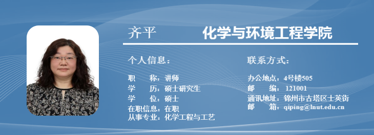 齐平,女,1974年2月生,辽宁锦州人,工学硕士,讲师。2007年硕士毕业于辽宁工业大学材料物理与化学专业,获工学硕士学位。先后在锦州石化公司异丙醇车间工作和辽宁工业大学化学与环境工程学院硕士研究学习。2007年4月到辽宁工业大学化学与环境工程学院任教。 近年来主要从事“纳米催化与能源化学”的研究,主要在二甲醚制氢、甲烷转化、CO消除等方面进行基础与应用基础研究。参加中国国家自然科学基金面上项目1项,参加中国国家自然科学基金青年项目2项;以第一通讯作者在RSC Advances.国外知名SCI期刊发表论文2篇;以第一发明人申请国家发明专利2件,授权1件。指导本科生多次参加全国大学生化工设计竞赛获国赛一等奖1项,二、三等奖共10项,参加第十五届挑战杯辽宁省大学生课外学术科技作品竞赛获得省三等奖1项。 Ø 教育及工作经历 2007.04-至今 辽宁工业大学 化学与环境工程 讲师 2004.09-2007.03 辽宁工业大学 材料物理与化学 工学硕士 1997.08-2004.08 中国石油天然气股份有限公司锦州石化分公司 异丙醇车间 1993.09-1997.07 辽宁石油化工大学 化工工艺 工学学士 Ø 研究方向 纳米催化与能源化学 Ø 代表性科研成果(专著、论文、发明专利及获奖) 1. Ping Qi; Xiaoxu Gao; Jian Wang; Huimin Liu*; Dehua He; Qijian Zhang*. A minireview on catalysts for photocatalytic N2 fixation to synthesize ammonia. RSC Advances. 2022, 12: 1244-1257. 2. Ping Qi; Jian Wang; Xavier Djitcheu; Dehua He; Huimin Liu*; Qijian Zhang*. Techniques for the characterization of single atom catalysts. RSC Advances. 2022, 12: 1216-1227. 3. 齐平; 李君华; 张启俭; 周迎春; 王欢; 郭洁; 氯盐型融雪剂的复合缓蚀剂及其应用, 2014-07-30, 中国, ZL201310213924.5. 合作文章: 1. Jing Li; Qi-Jian Zhang*; Yong-Hua Zhao; Ping Qi; Chao Shao; Alkaline earth metal oxide modification of Ni/Al2O3 for hydrogen production from the partial oxidation and reforming of dimethyl ether, Reaction Kinetics, Mechanisms and Catalysis, 2017, 122: 1193-1202. 2. Xu Long; Qi-Jian Zhang*; Zhao-Tie Liu; Ping Qi; Jian Lu; Zhong-Wen Liu*; Magnesia modified H-ZSM-5 as an efficient acidic catalyst for steam reforming of dimethyl ether, Applied Catalysis B: Environmental, 2013, 134-135: 381-388. 3. Jing Li; Qi-Jian Zhang*; Xu Long; Ping Qi; Zhao-Tie Liu; Zhong-Wen Liu*; Hydrogen production for fuel cells via steam reforming of dimethyl ether over commercial Cu/ZnO/Al2O3 and zeolite, Chemical Engineering Journal, 2012, 187(1): 299-305. 4. 李静; 张启俭; 齐平; 韩丽; 邵超; Pt/TiO2催化二甲醚部分氧化重整制氢, 工业催化, 2017, 25(6): 19-23. 5. 张启俭; 齐平; 周迎春; 富氢气体中CO优选氧化反应: Au与载体相互作用的影响, 催化学报, 2008, 29(4): 361-365. |